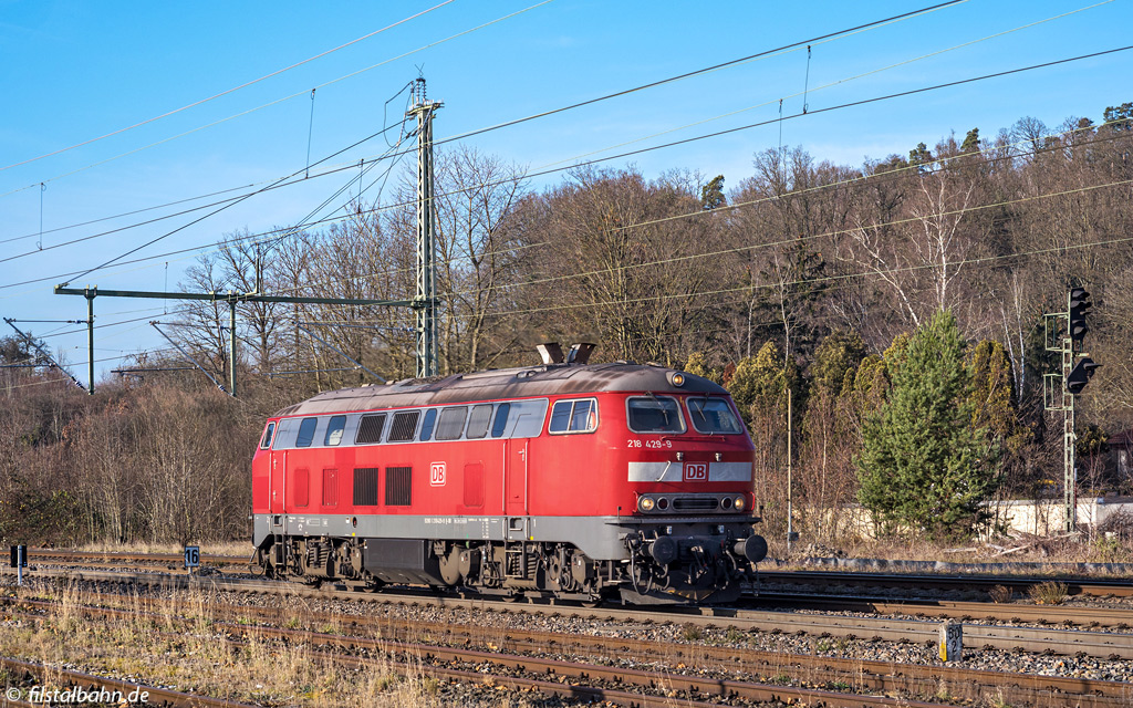 Seit Dezember 2022 befindet sich 218 308 als Mietlok im Bestand der Lokdienste Braun GmbH (LDB) Mit leeren Schwellenwagen am Haken war sie im Filstal gen Osten unterwegs.