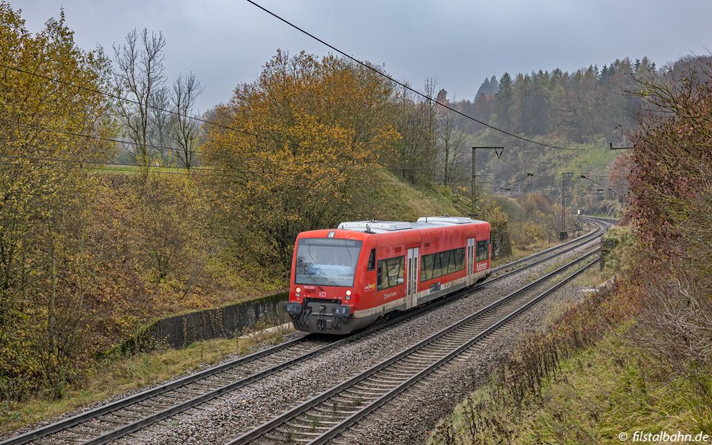 Die Stammstrecke von 650 308 ist die sog. "Kulturbahn" von Tübingen über Horb nach Pforzheim. Während einer Dienstfahrt über die Hausstrecke konnte der Triebwagen auf der Geislinger Steige beobachtet werden.