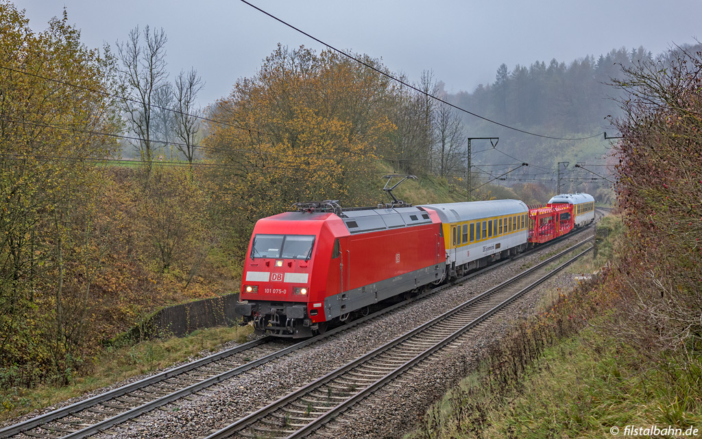 Die letzten Wochen brachten nur wenige Sonnentage mit sich. Auch als 101 075 mit einem Messzug zwischen Geislingen und Westerstetten pendelte herrschten suboptimale Lichtverhältnisse am Albaufstieg.