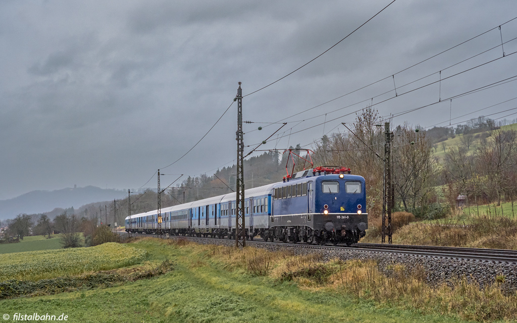 Mit einem Leerreisezug der Schienenverkehrgesellschaft mbH Horb war 115 261 (seit Juni 2024 in kobaltblauem Lack) von Stuttgart nach Augsburg unterwegs. Nicht nur in Kuchen war zu diesem Zeitpunkt strömender Regen angesagt.