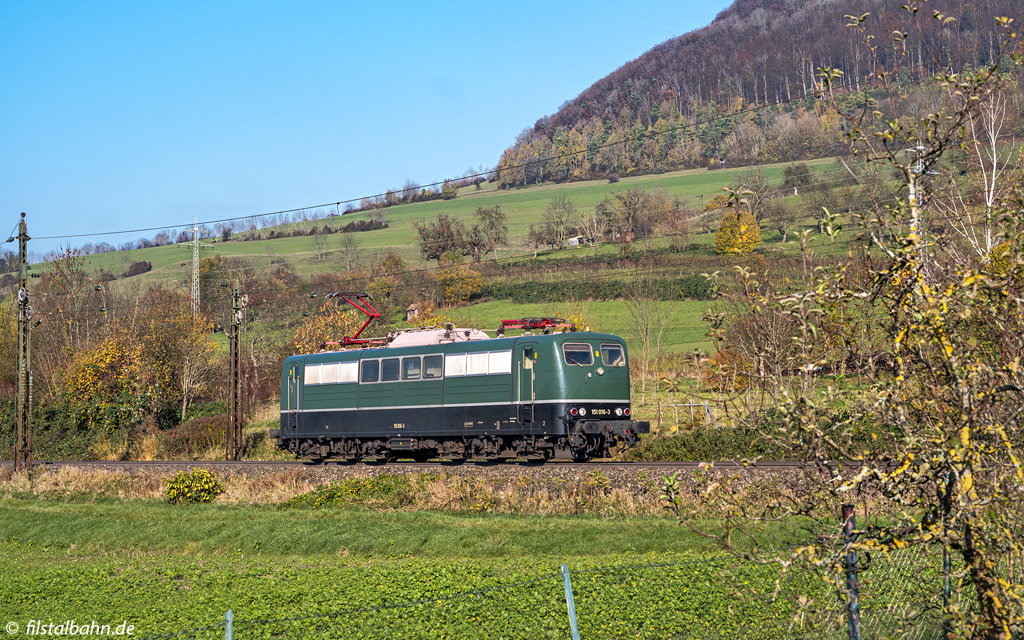 Das Wetter im Filstal passte perfekt um 151 016 der BayernBahn zum wiederholten Mal abzulichten. Der chromoxidgrüne Sechsachser fand in Kuchen den Weg in der Kamera.