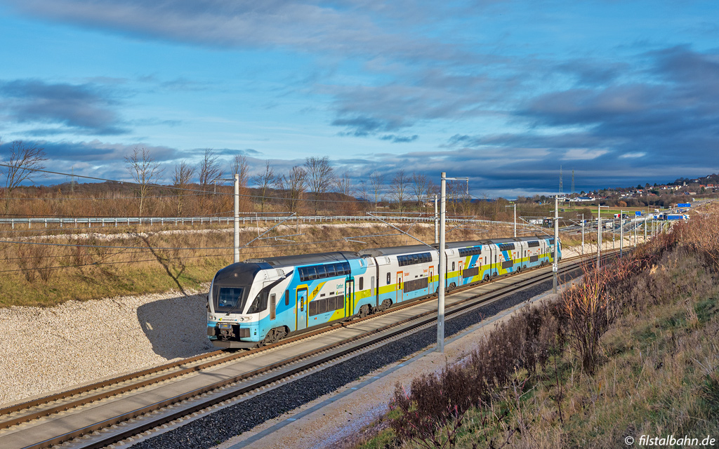 Seit dem Winterfahrplan verkehren täglich zwei Triebzugpaare der Westbahn GmbH von Wien Westbahnhof nach Stuttgart und retour. Bei tief stehender Sonne eilte 4010 026 als WB 962 bei Holzmaden in Richtung Stuttgart über die Schnellbahntrasse.