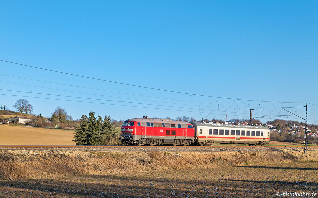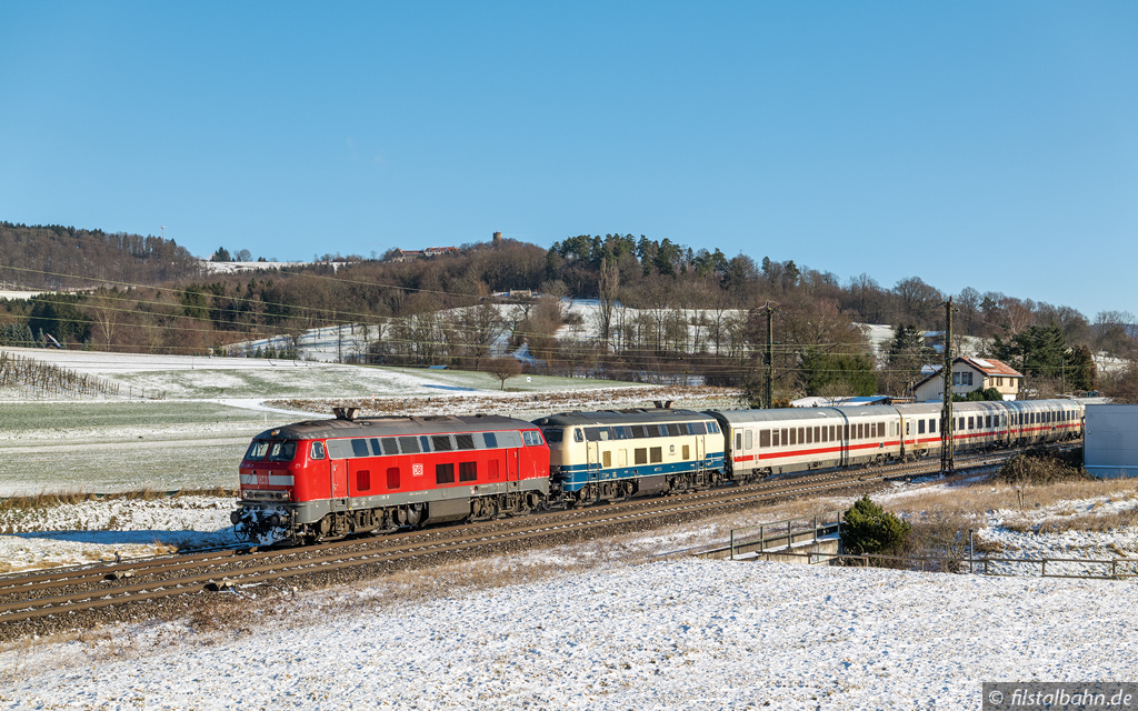 Planmäßig ließ der IC 2012 mit 218 411 und 218 446 das ehemalige Bahnwärterhaus in Salach hinter sich. Etwas Schnee aus dem Allgäu zierte die Lokfront der führende Maschine auf der Fahrt in die Landeshauptstadt.