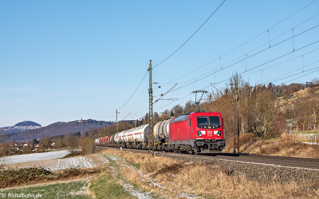 Mit einem gemischten Güterzug zeigte sich die saubere 187 187 in Kuchen. Das Gespann rollte langsam gen Geislingen wo mutmaßlich eine Schublok an den Zug ging.