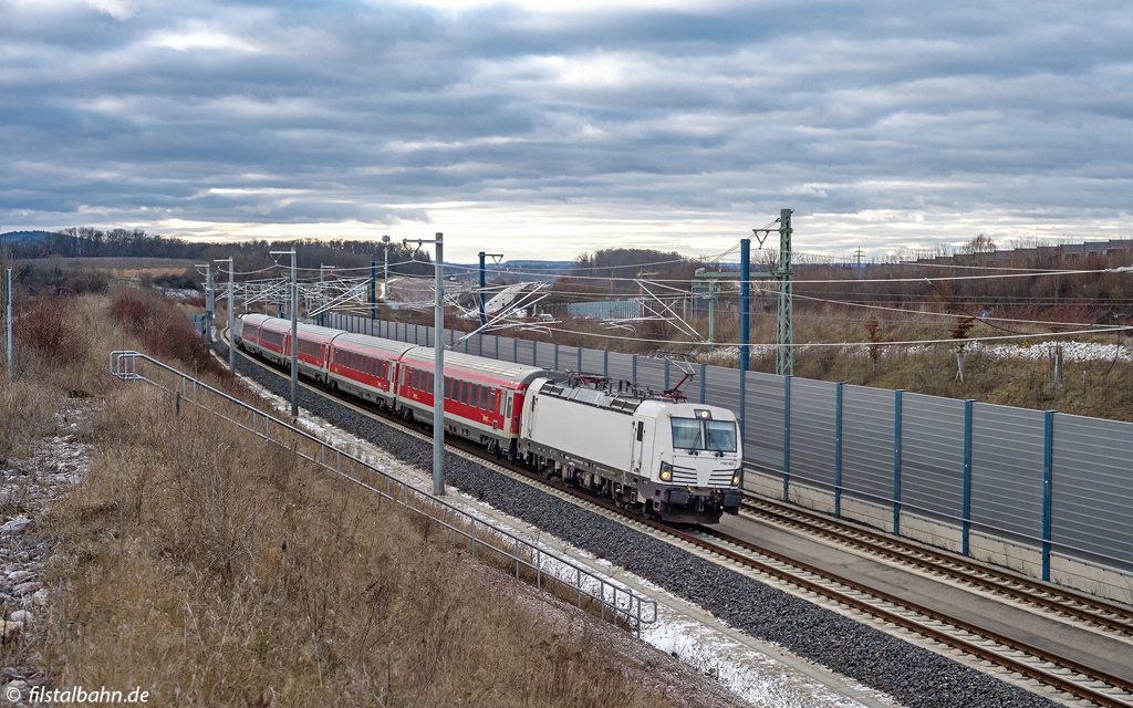 218 839 von DB Fernverkehr hatte einen in Oberstdorf abgestellten IC 1 Schadwagen abgeholt. In Uhingen sorgte die tief stehende Sonne bereits für lange Schatten. Trotzdem fand sich eine brauchbare Lücke, um die Fahrt nach Stuttgart zu dokumentieren.