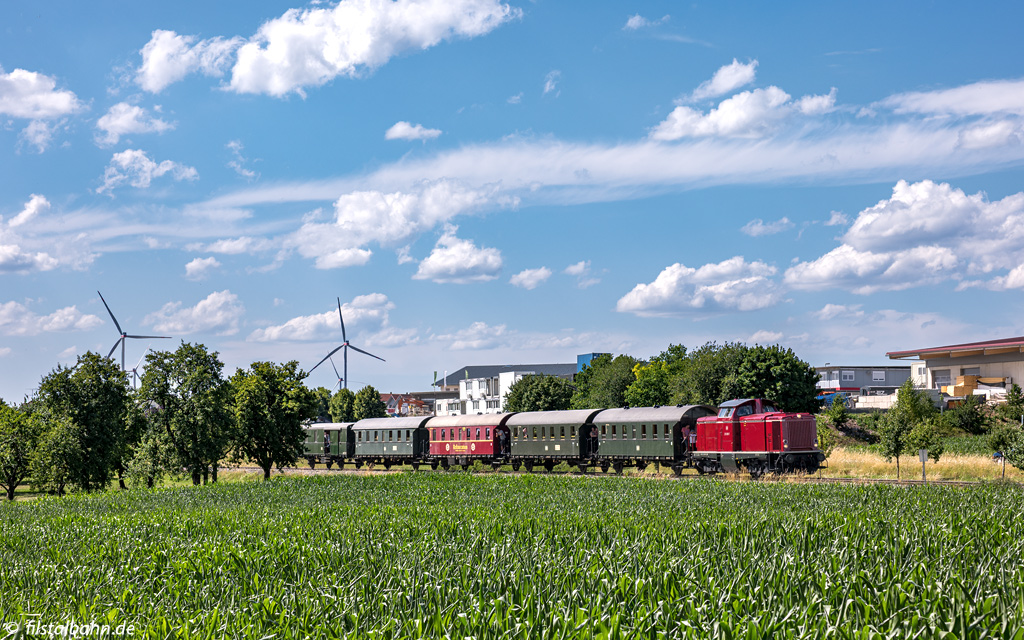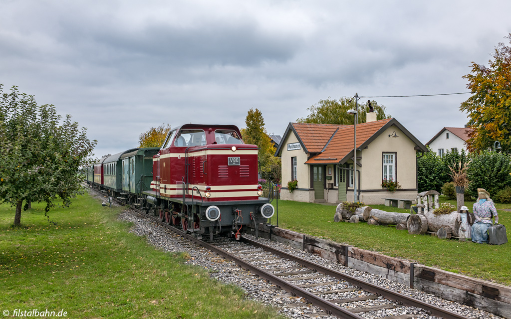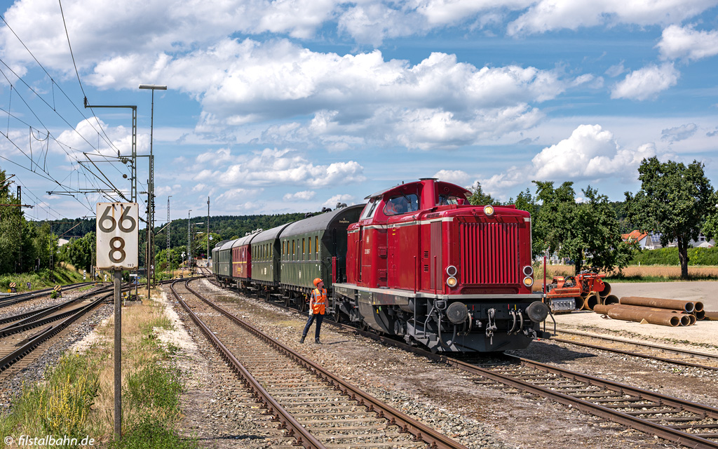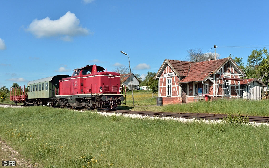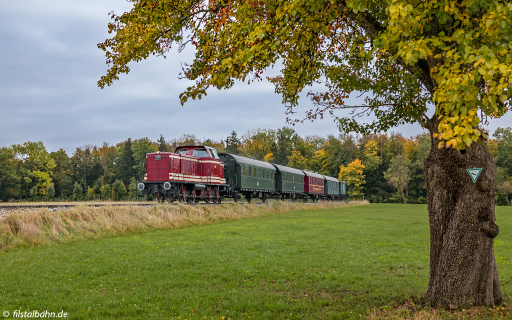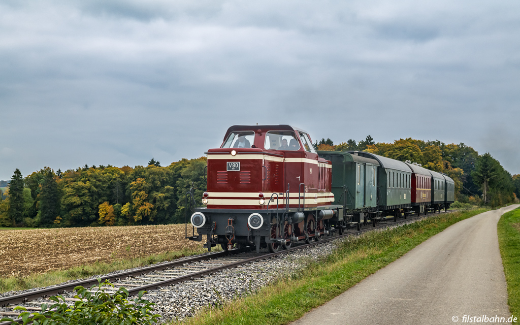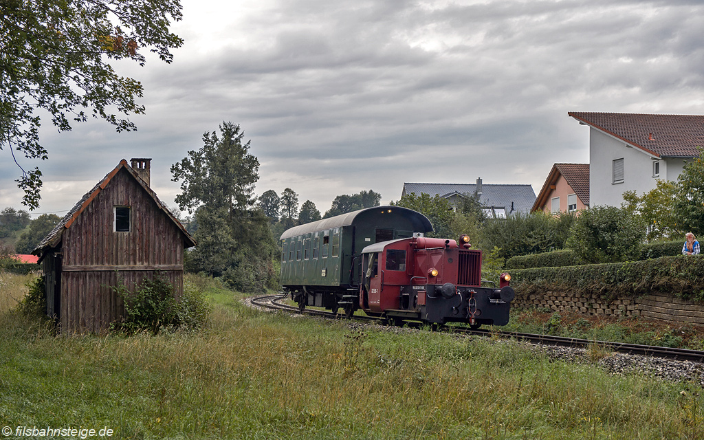 Am Wochenende war der Museumszug auf der UEF-Lokalbahn mit 212 089 (Ex V100 2089) bespannt. Hierfür musste jeweils in Amstetten und Gerstetten die Lok umgesetzt werden.
