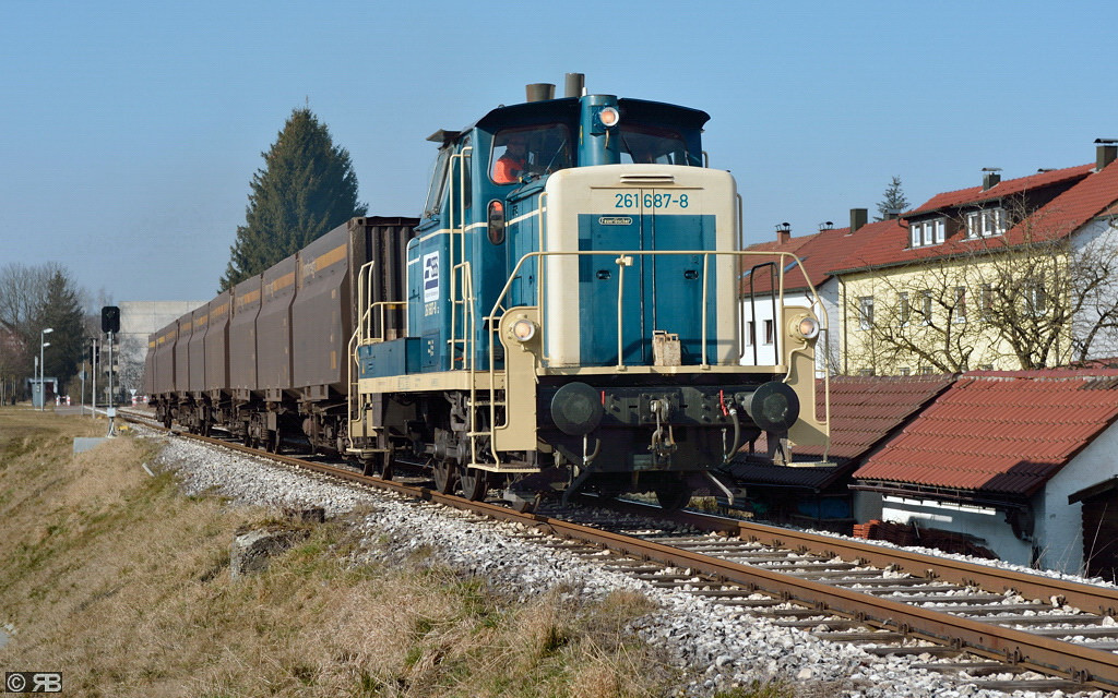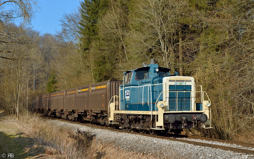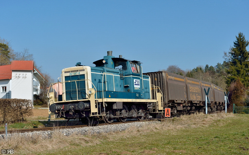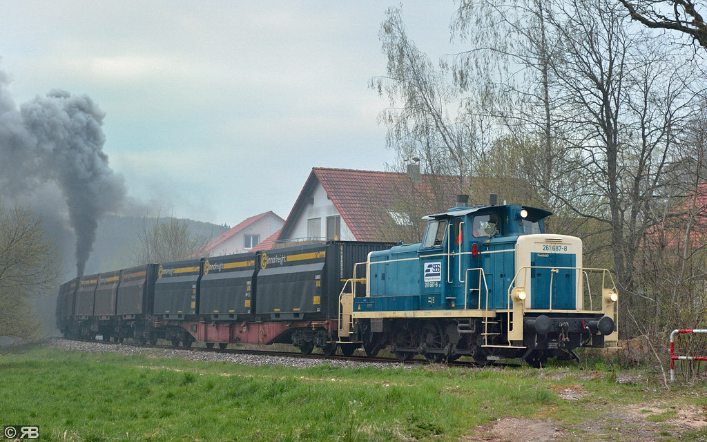 Nach Schliessung der Bahnschranken verlässt 261 687 der SBS (Stuttgarter Bahnservice) den Lokalbahnhaltepunkt Amstetten mit bekannter Fracht in Richtung "WiFo"-Gelände.