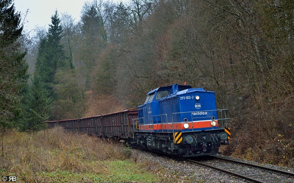 An diesem Samstag fuhren wieder Sandzüge von Amstetten zum rund 3,5 km entfernten "WiFo"-Gelände. Diesmal war 293 002 mit vier Eans kurz vor dem im Wald gelegenen
