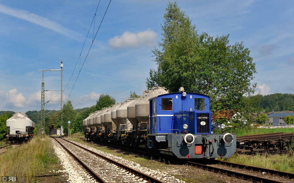 Auf dem Abstellgleis in Amstetten. Mit einer Leistung von 107 PS kann es der "Blaue Klaus" (Bj 1952, Fa. Deutz) auch mit einigen Silowagen der Bauart Ucs (Zwiebelwagen) aufnehmen.