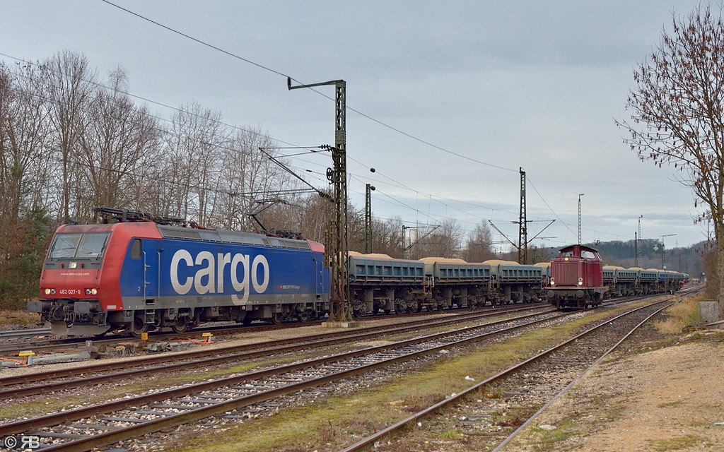 dort mit LKW zu den Tunnelbaustellen der NBS Stuttgart-Ulm transportiert. 482 027 schiebt gerade einen Ganzzug bestehend aus Kippwagen (Fas 126) auf das Anschlussgleis der
