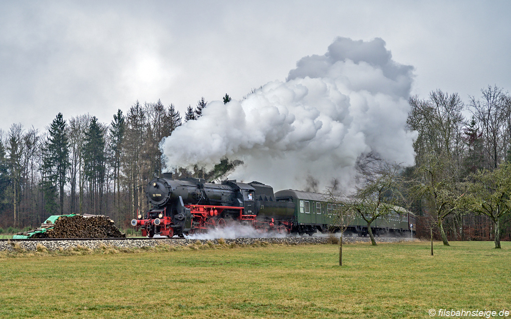 Dreikönigsdampf-Veranstaltung der EFZ. Am Bahnübergang vor Gussenstadt bot sich nochmals die Gelegenheit den Zug mit den vorderen zwei Wegmann-Wagen zu fotografieren.