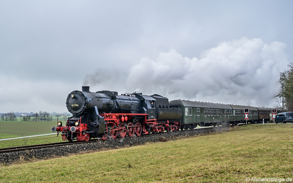 Dreikönigsdampf-Veranstaltung der EFZ. Die Scheinanfahrt nach dem Haltepunkt Waldhausen war beendet und 52 7596 beschleunigte den Sonderzug wieder.