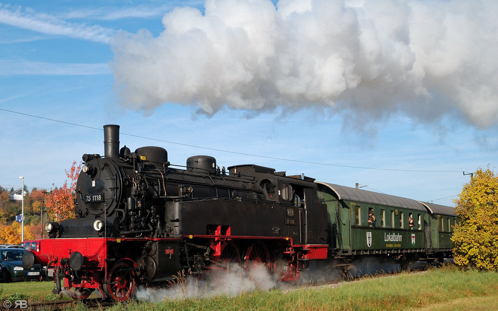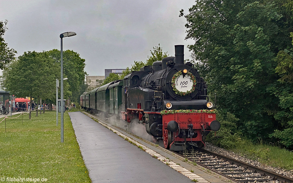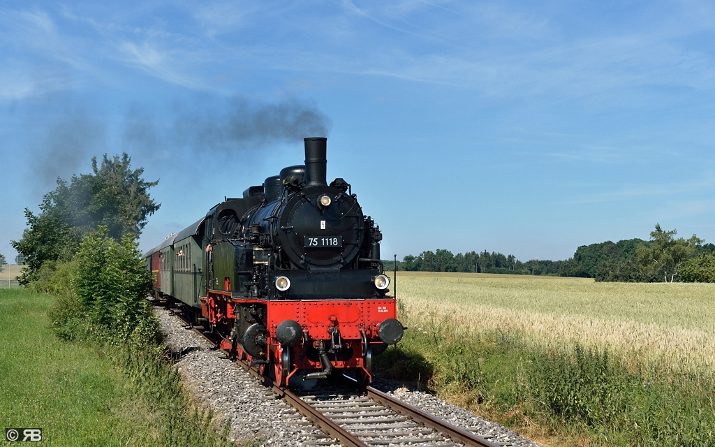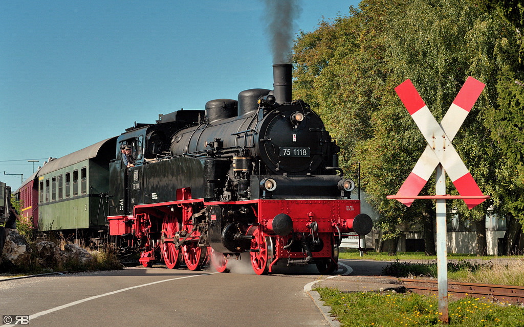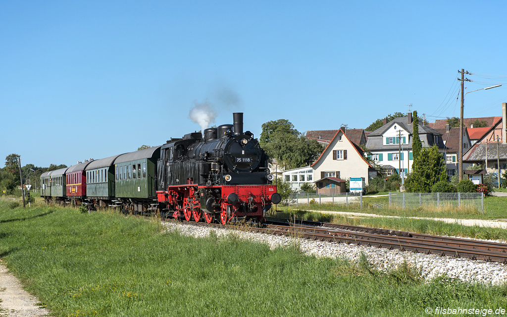 Zum hundertjährigen Jubiläum der badischen 75 1118 hatten die Betreiber der UEF-Lokalbahn ihre Maschine festlich herausgeputzt. Trotz der Wetterkapriolen