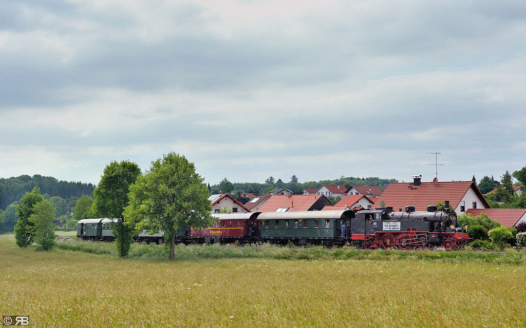 Lokalbahndampf im Juli bei optimalem Wetter! In Waldhausen hatte sich der nahezu vollbesetzte Zug nach einem kurzen Halt wieder in Bewegung gesetzt.