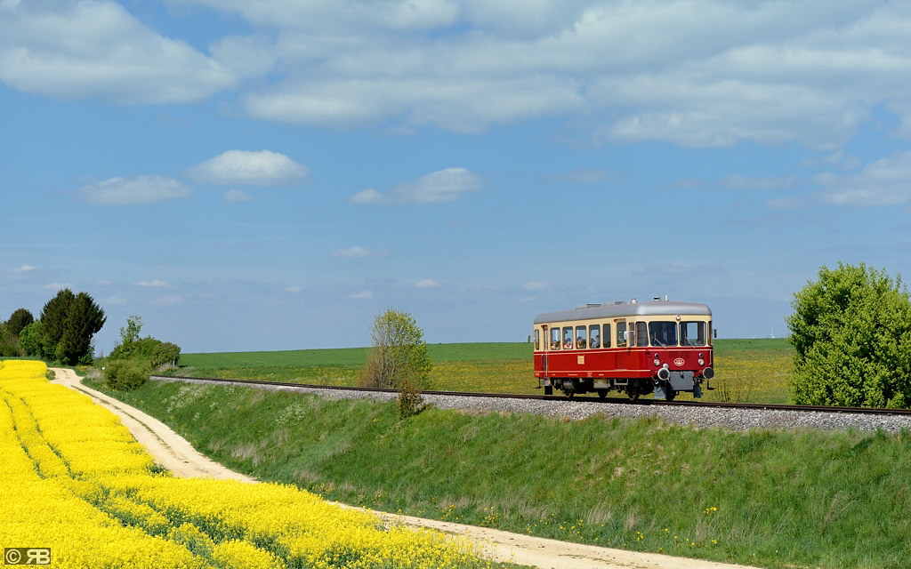 Bei der Verfolgung des Zuges entlang der Strecke konnte noch ein weiteresFoto am Ortsrand von Waldhausen mit einem Rapsfeld im Vordergrund angefertigt werden.