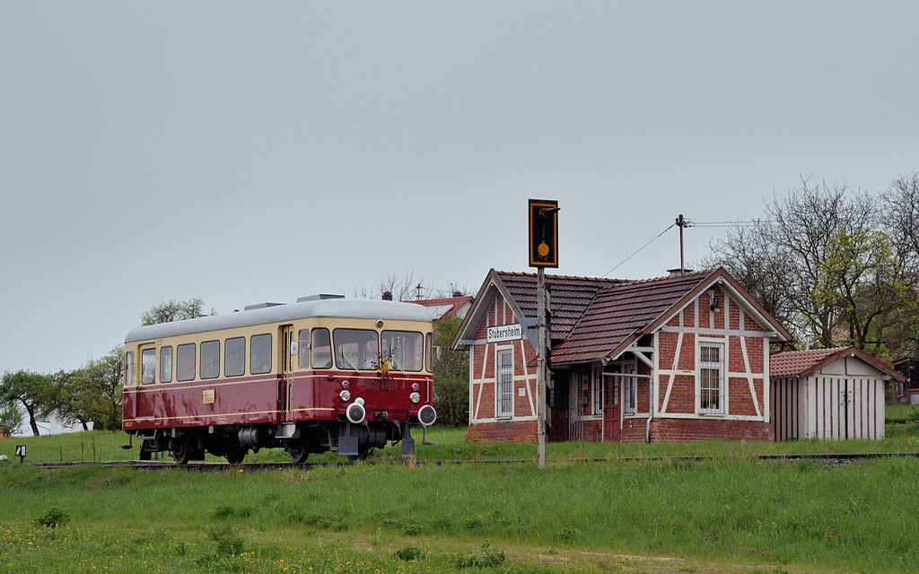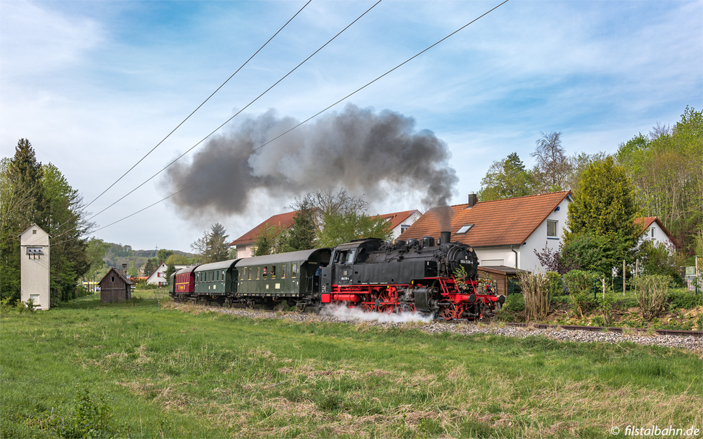 Mit mehreren Pfiffen hatte sich 212 089 in Gussenstadt bemerkbar gemacht. Am Ortsende konnte der Zug trotz vieler Wolken nochmals bei Sonnenschein fotografiert werden. Es bleibt