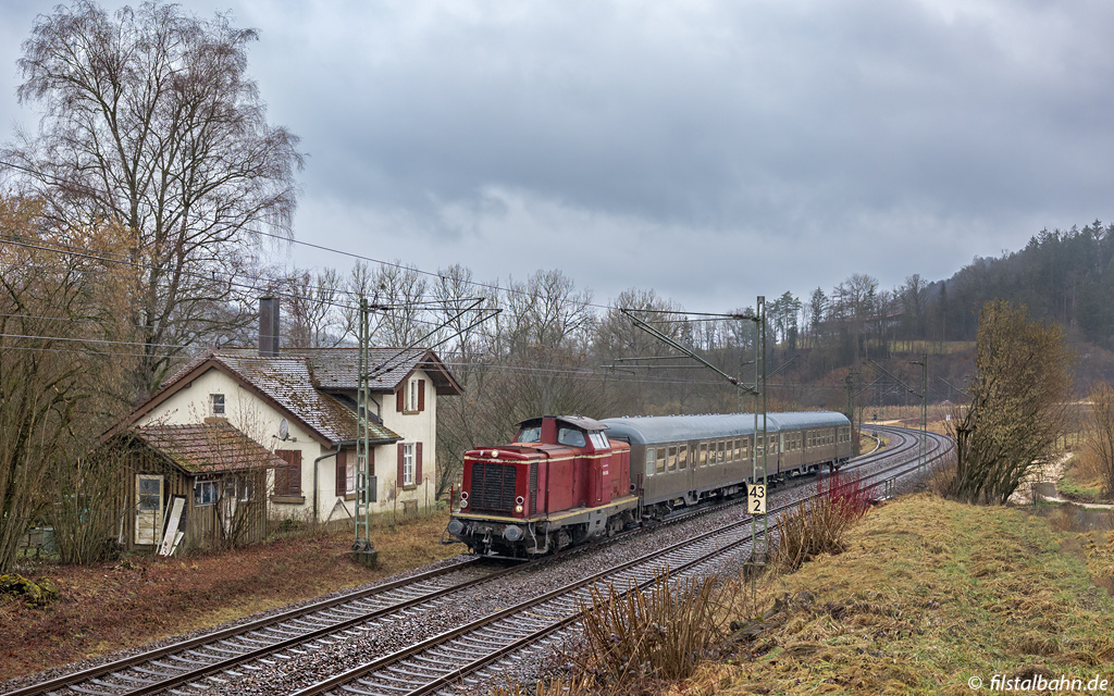 Zu Filmdreharbeiten des ZDF in Epfenhofen-Blumberg war V100 1365 der BayernBahn GmbH mit zwei Silberlingen am Drehort. Ein Regionalzug zur Weihnachtszeit der 1960er Jahre war darzustellen. Nach Beendigung der Dreharbeiten erfolgte die Rückfahrt zudem über die Remsbahn nach Nördlingen. Trotz widriger Wetterbedingungen konnte an der ehemaligen Blockstelle bei km 43,2 ein Foto des Zuges angefertigt werden.