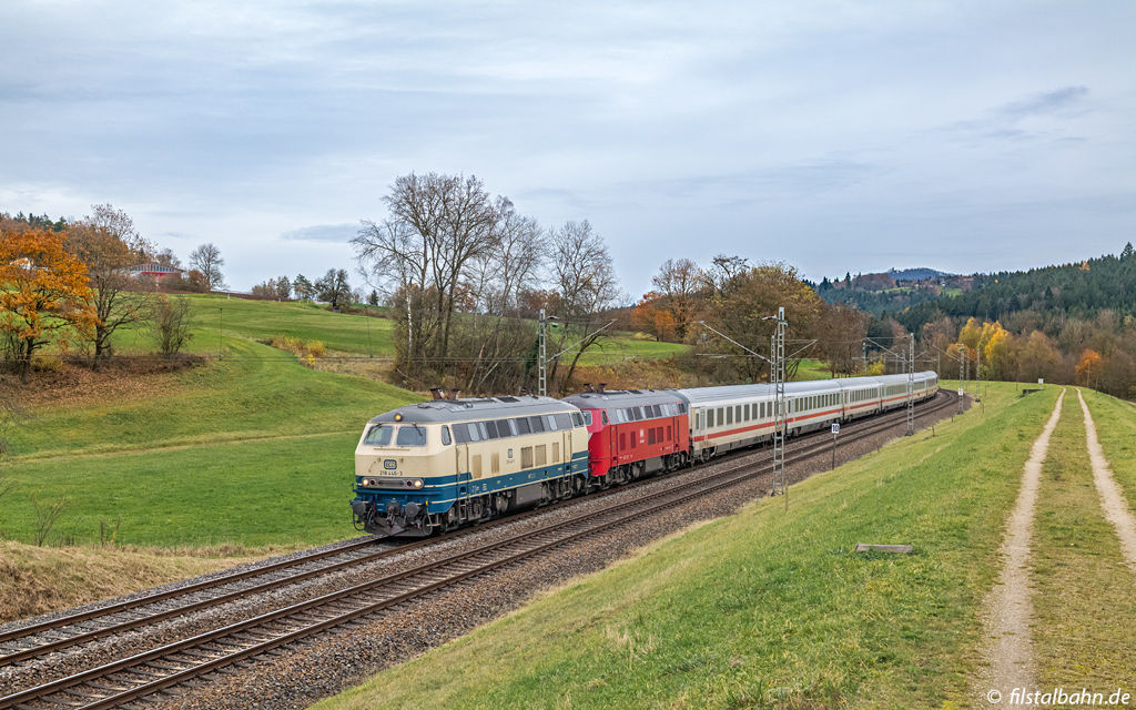 Remstalbahn nach Stuttgart. Gegen 14:00 Uhr erreichte der Zug bei Lorch die wartenden Fotografen. Am Zug war 218 446 und 218 406.