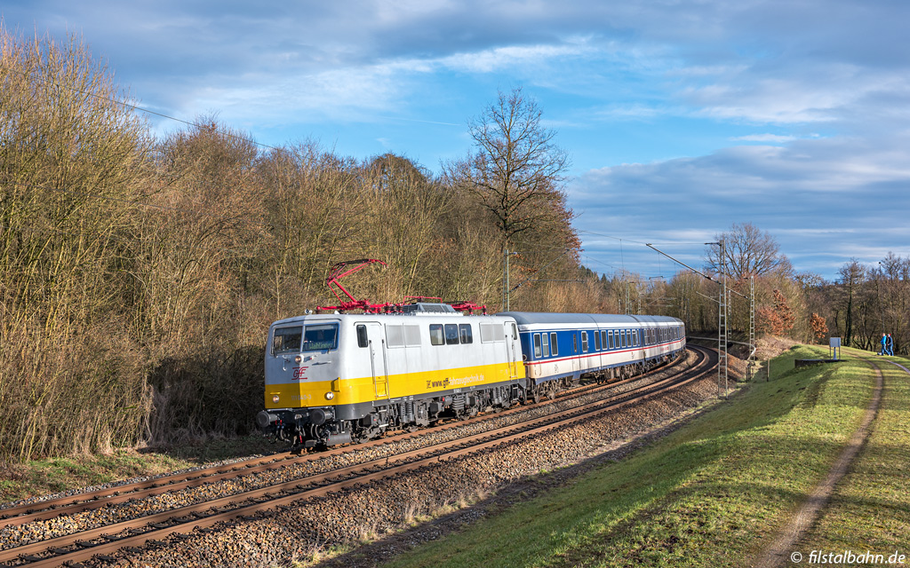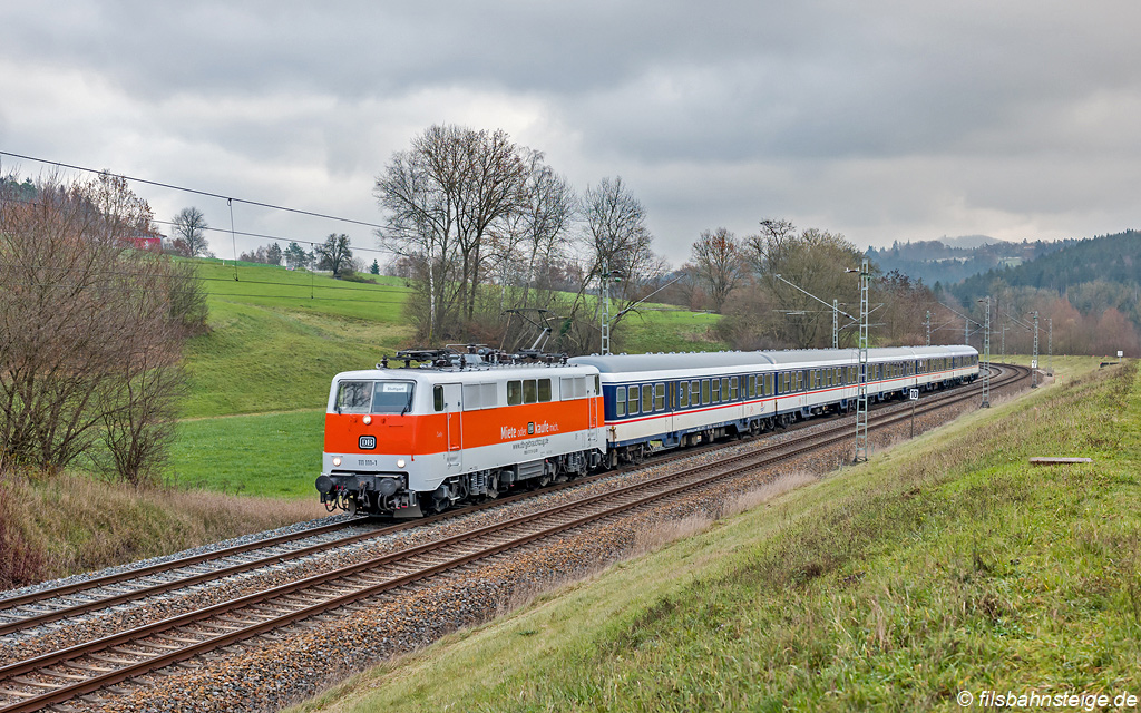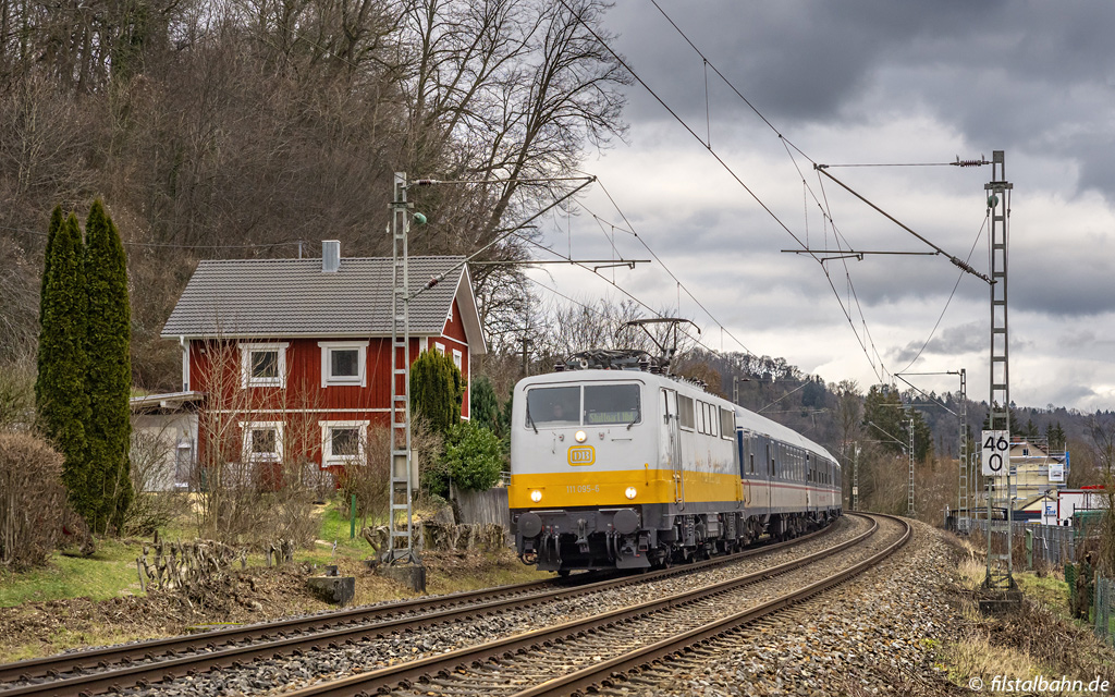 Auch 111 095 von db-gebrauchtzug ist für die MEX Ersatzdienste auf der Remsbahn tätig. Die ebenfalls im Lufthansafarbschema lichtgrau/melonengelb lackierte Lok war samt TRI Wagengarnitur am westlichen Stadtrand