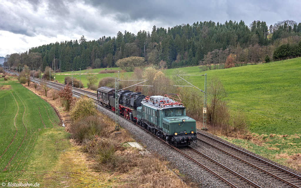 die Maschine ins Eisenbahnmuseum Dresden Altenstadt überführt. Bei Schwäbisch Gmünd entstand die Aufnahme des Überführungszuges mit E 94 088.